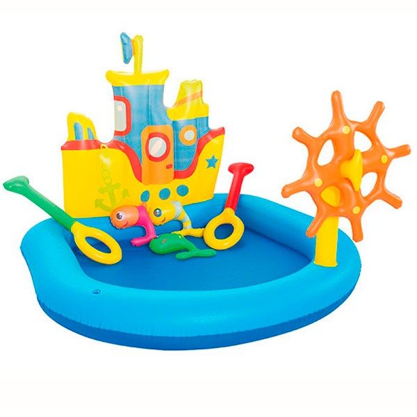 No habrá nada más divertido que surcar los mares sobre un barco remolcador, provisto de timón, de remos y de dos simpáticos pececitos que viajarán a bordo junto a toda la tripulación. Este centro de juegos hinchable es, al mismo tiempo, una piscina de tamaño mediano, de bordes redondeados y con capacidad para 84 litros de agua.