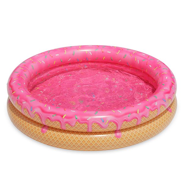 Esta piscina hinchable con diseño de donut es de vinilo resistente y tiene 2 aros hinchables que imitan a este bollo. Las dimensiones del donut hinchable son de 114x114x25 cm y su vinilo tiene un grosor aproximado de unos 0,25mm. Está recomendada para niños a partir de 2 años con supervisión de un adulto. De excelente calidad y muy resistente al desgaste del uso diario y a los rayos UV. La diversión está asegurada este verano con este modelo de piscina hinchable para pequeños y mayores.