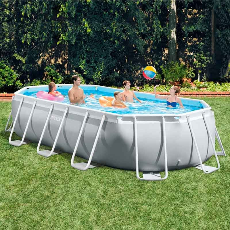 La piscina ovalada desmontable modelo Prism Frame de la marca Intex se convertirá en el lugar favorito de tu hogar durante los meses más calurosos del año. Tiene una capacidad de 13365 litros de agua y pueden usarla hasta 6 personas al mismo tiempo. Incluye depuradora de cartucho tipo A con capacidad de filtración de 5678 litros/hora y sistema Hydro Aeration Technology. El armazón está compuesto por una lona tricapa de PVC-poliéster de primera calidad y 12 contrafuertes de barras tubulares recubiertos con pintura epoxi anticorrosión y antióxido. La pared interior tiene un diseño en azul simulando gresite y la pared exterior es de un suave color gris. Además, incluye tapón de vaciado para facilitar el drenaje, escalera de seguridad con plataforma y escalones desmontables, tapiz y cobertor.