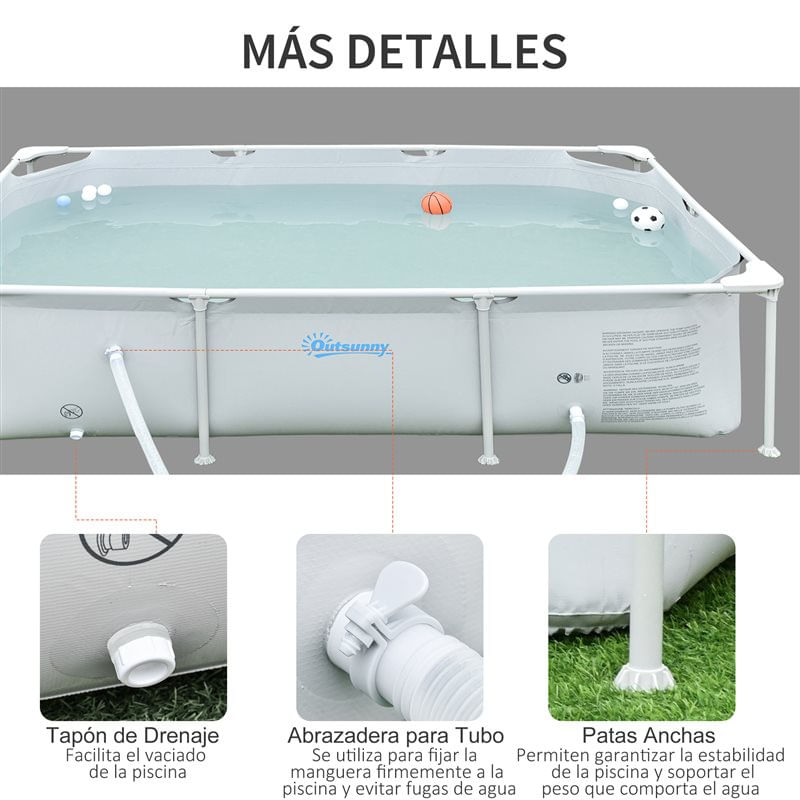 Combate el calor y diviértete en compañía de tu familia o amigos gracias a esta piscina de Outsunny. Esta piscina cuenta con una estructura tubular de acero lacado con recubrimiento en polvo, haciéndola muy resistente a la intemperie y a la oxidación. Además, las paredes laterales están fabricadas con PVC reforzado de alta densidad, para resistir a los impactos y a los rayos UV. Por otro lado, las patas de la piscina cuentan con bases anchas que proporcionan una gran estabilidad y firmeza, evitando que vuelque. Incluye una depuradora de filtro de cartucho, para que puedas mantener el agua limpia y evitando que tengas que cambiarla frecuentemente. También incluye un tapón de drenaje para facilitar el vaciado y una abrazadera para tubo que ayudará a fijar la manguera a la piscina, evitando fugas. Es una piscina recomendada para toda la familia.
