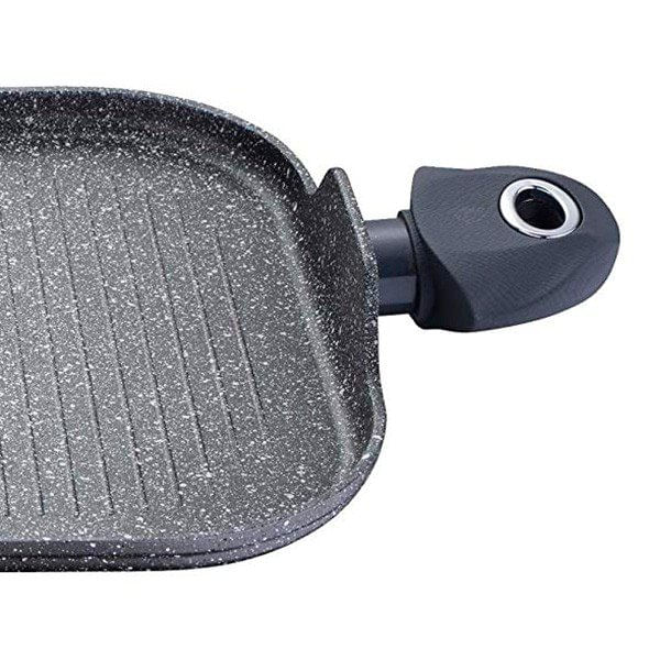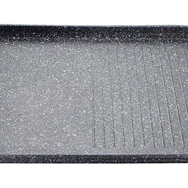 Plancha con distinta superficie de cocinado de la reconocida marca Bergner. Su interior y exterior están revestidos en color gris con efecto mármol. Está fabricada en aluminio forjado de grado alimenticio, lo que le confiere mayor ligereza y resistencia. Además, es totalmente antiadherente por lo que podrás cocinar con menos grasas, de forma saludable y sin el temor de que la comida se te quede pegada en el fondo de la olla. Sus asas laterales siempre se mantendrán frías durante el proceso de cocinado y presentan un elegante diseño de piel de serpiente. Este modelo de la serie Orion puede utilizarse en todo tipo de cocinas, incluidas las de inducción. Su sólida base permite el reparto equitativo del calor por toda la superficie consiguiendo así el perfecto cocinado de los alimentos.
