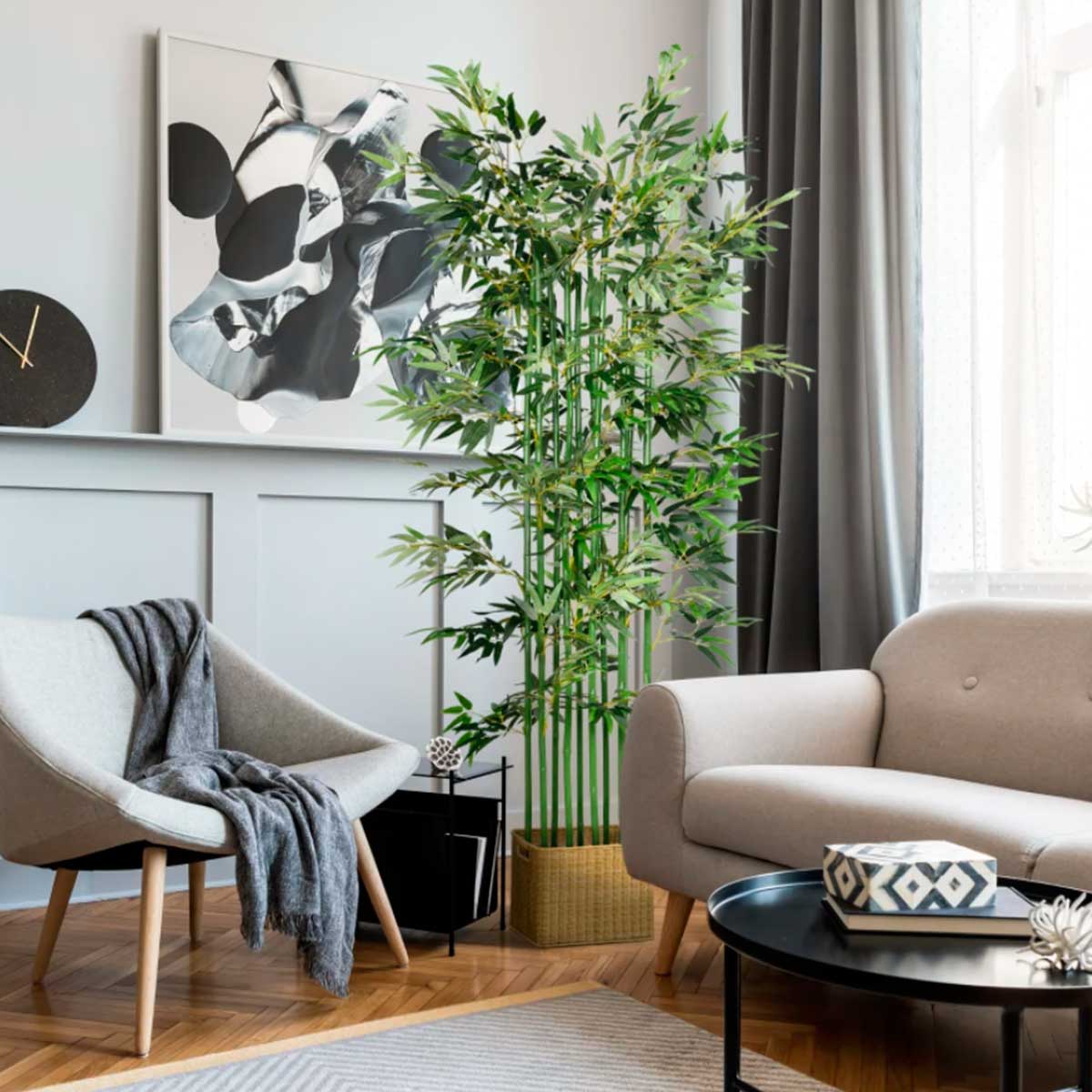Si te encanta el estilo y la decoración que aporta cualquier planta a un espacio, pero su mantenimiento no es lo tuyo, te presentamos esta estupenda planta artificial de bambú con 1640 hojas que aportarán frescura y elegancia a cualquier lugar en el que la coloques. Está fabricada con poliéster, bambú y madera, materiales de primera calidad, muy resistentes y duraderos. Lo mejor que tienen este tipo de plantas es su bajo mantenimiento, ya que no requieren ni podas, ni fertilizantes ni riegos. Cuenta con una base vistosa y elegante que le proporciona gran estabilidad. ¡No lo dudes más y decora tu hogar con esta super planta artificial de bambú a un precio bestial!
