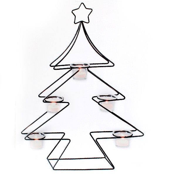 Se compone de una doble estructura metálica con acabado en negro. Una estrella de 5 puntas destaca en la copa del árbol recordando a la estrella anunciadora de Belén. Sus ramas están preparadas para ser decoradas con una ornamentación muy especial: la luz de las velas; símbolo de los buenos deseos para el año entrante. Podrás colgar hasta un total de 5 velas con sus correspondientes vasos de cristal. Tiene una altura de 51 cm.