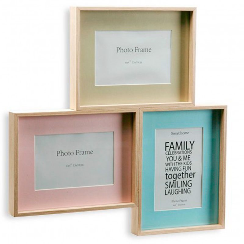 Dar a cada estancia de tu hogar un estilo y personalidad propias eligiendo la decoración adecuada para cada una de ellas es imprescindible para sentirte cómodo en cada espacio. El marco de fotos de la marca Home&Deco es una de esas piezas atemporales que podrás colocar en cualquier estancia de tu hogar para exhibir tus fotos favoritas. Está fabricado en madera de color beige con los marcos interiores en color arena, rosa y azul. Podrás instalarlo en la pared con total facilidad gracias a que cuenta con colgador en la parte trasera. Tiene capacidad para colocar 3 fotos, 2 horizontales y 1 vertical de 10x15.