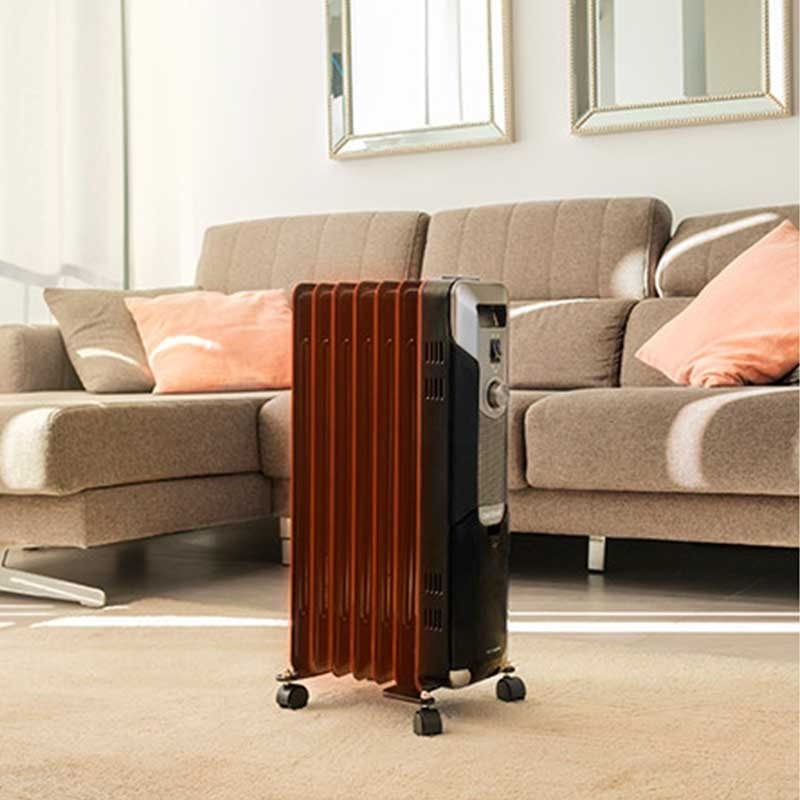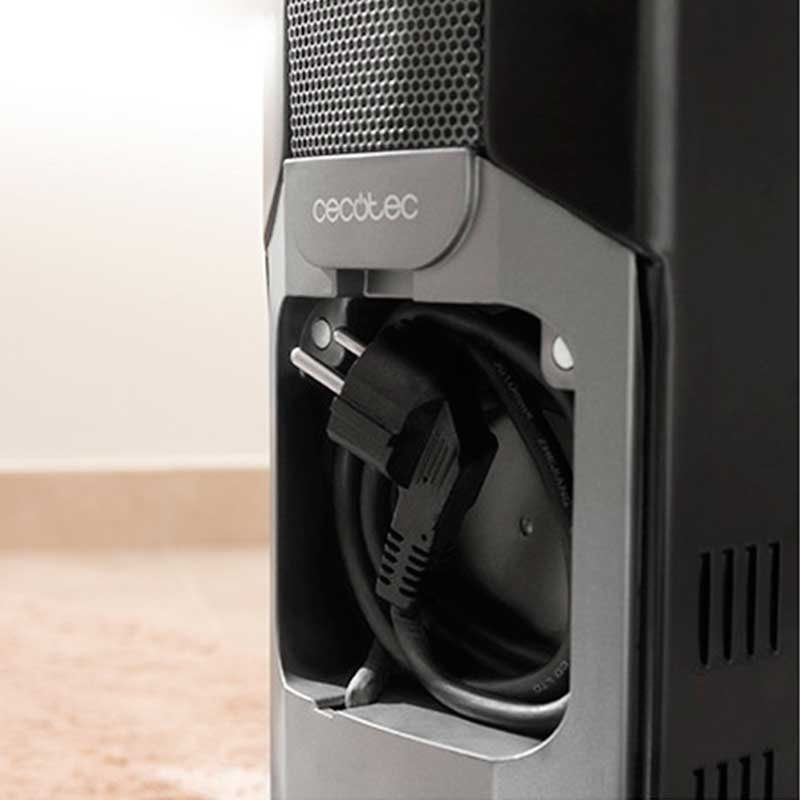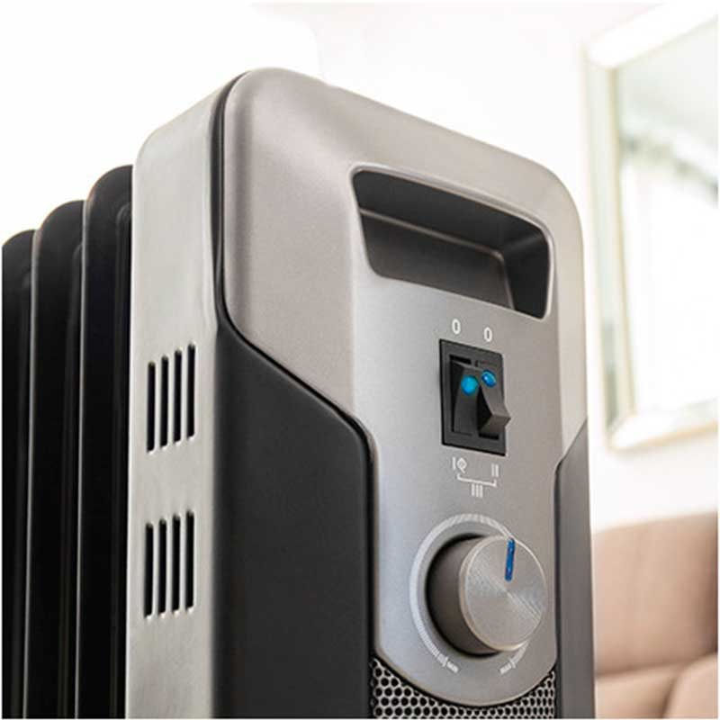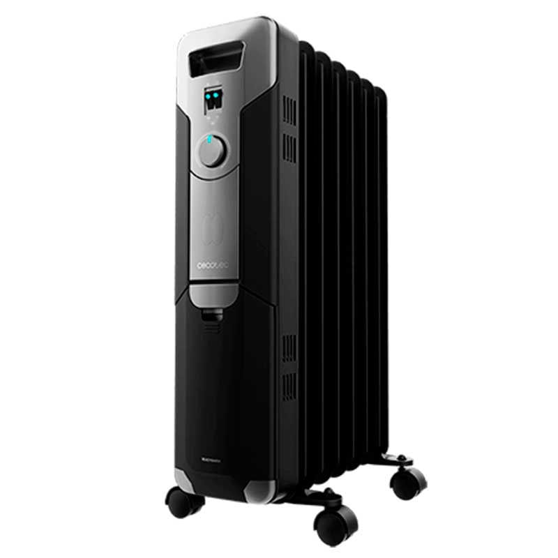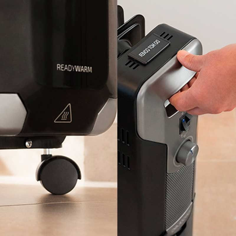 El radiador de aceite modelo Ready Warm 7000 Space Black cuenta con 7 módulos y una gran potencia de 1500W para calentar la estancia donde lo ubiques de manera rápida y eficiente. Gracias a su tecnología WarmSpace el radiador es capaz de calentar estancias de hasta 15 m². El termostato es regulable con 3 niveles de potencia: potencia mínima de 600W (Eco), media de 900W y máxima de 1500W. Cuenta con recogecables y dispone de mango ergonómico y ruedas multidireccionales que permiten desplazarlo fácilmente. Viene con doble sistema de seguridad ya que cuenta con protección contra sobrecalentamiento y apagado automático de seguridad.