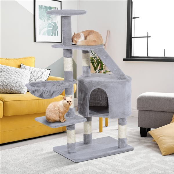 ¿Quieres buscar un excelente hogar para que tu querido gato se divierta sin límites? Nuestro árbol de gato multifuncional forrado con felpa extra suave, ofrece un espacio muy có modo y de mucho confort. Los gatos pueden jugar en este centro de poste, saltar para entrenar su agilidad y/o equilibrio, arañar las columnas de sisal y subir los peldaños de la escalera. Dispone de una cueva y hamaca para que tu gato pueda relajarse y dormir con mayor comodidad. ¡La estructura del rascador está fabricada en tablero madera aglomerado y toda la superficie forrada con felpa, por eso, no necesitas temer por la seguridad y bienestar de tus mascotas! Acabado en tablero madera aglomerado de alta calidad, resistente y duradero Toda la superficie está cubierta por felpa extra suave y confortable Diseño multifuncional, hamaca y cueva para relajar, sisal para arañar, plataforma y escalera para subir y saltar Columna y peldaños de la escalera enrollados de sisal grueso Plataforma redonda superior es utilizada para que los gatos rasquen Rascador para gatos fácil de transportar y montar