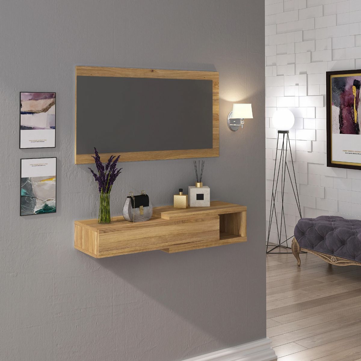 Decora la entrada de tu hogar con el precioso recibidor modelo New Aura, perfecto para darle un toque dinámico y diferente a tu recibidor. Este conjunto está formado por un amplio espejo en el que podrás mirarte antes de salir y comprobar tu look, y por un mueble horizontal de instalación mural que se adapta fácilmente a cualquier pared. El mueble cuenta con un práctico cajón donde puedes guardar llaves, documentos o cualquier objeto que necesites tener siempre a mano.