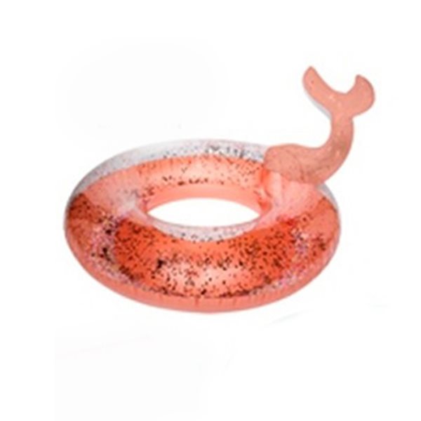 Flotador hinchable en forma circular con diseño de cola de pez y con purpurina. Perfecto para relajarte cómodamente en la piscina o en el mar mientras disfrutas del sol y del movimiento del agua.