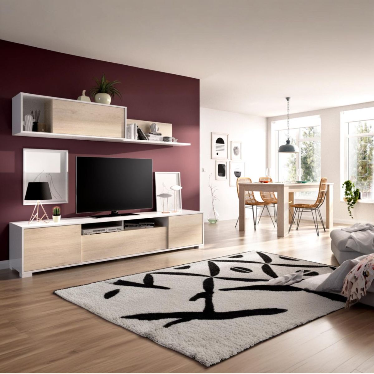 Si valoras la sencillez, el diseño cuidado y un buen espacio de almacenaje, la composición de salón modelo Ken es una opción ideal para completar tu salón o comedor. Fabricada con tablero de partículas melaminado y tablero de fibras de densidad media, esta composición está pensada para durar muchos años. Compuesta por un mueble de TV y un módulo superior, podrás colocar tu televisor de forma práctica y con estilo. El mueble de TV incluye dos puertas abatibles en los laterales, dos huecos abiertos perfectos para dispositivos electrónicos y una puerta abatible central que da acceso a un compartimento espacioso.