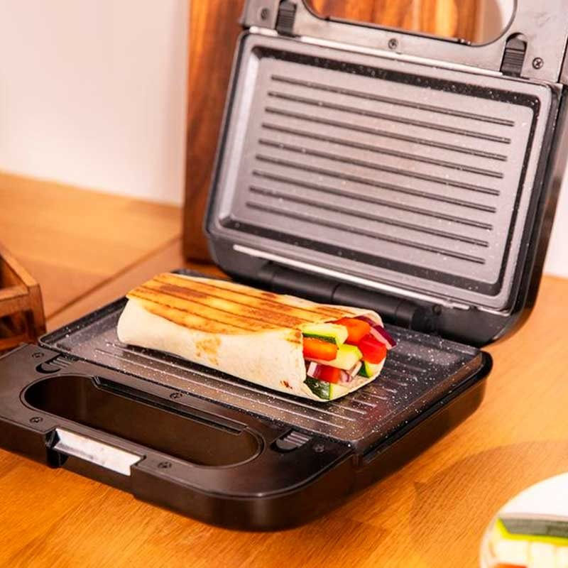 ¿Qué te parecería tener una sandwichera 4 en 1? Con esta sandwichera Rock’nToast 4in1 de Cecotec podrás hacer sándwiches cuadrados, partidos, gofres, y tostados uniformes en el grill. Tiene capacidad para 2 sándwiches o gofres de manera simultánea gracias a sus 2 placas de aluminio y sistema giratorio de 180º para poder calentar la comida de forma uniforme por ambas partes. Cuenta con 1000W de potencia para hacer que la comida esté crujiente por fuera y tierna por dentro. Incluye 4 placas desmontables e intercambiables para que escojas la que más te apetezca, y además, son aptas para el lavavajillas. Su uso es muy sencillo: sólo tienes que colocar los sándwiches dentro de los recuadros de la placa, bajar la placa de la parte superior y esperar la señal azul de sus indicadores de luz. Gracias a su placa de aluminio fundido con revestimiento antiadherente no se pegará nada y lo podrás limpiar muy fácilmente.