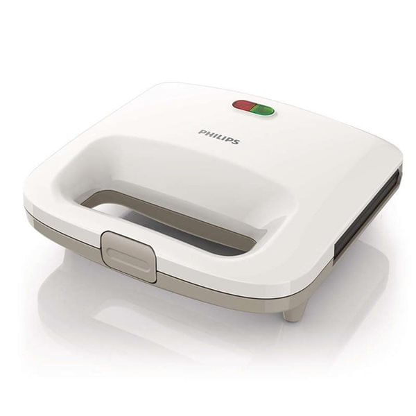 Sandwichera Philips Daily Collection con capacidad para 2 sándwiches. La forma no aplasta los sándwiches y el revestimiento es completamente antiadherente. Nunca más se volverá a pegar el queso. Con 820 W de potencia, patas antideslizantes y mango de tacto frío. Otra de las ventajas de la sandwichera es que se puede guardar en vertical por lo que no ocupa casi espacio.