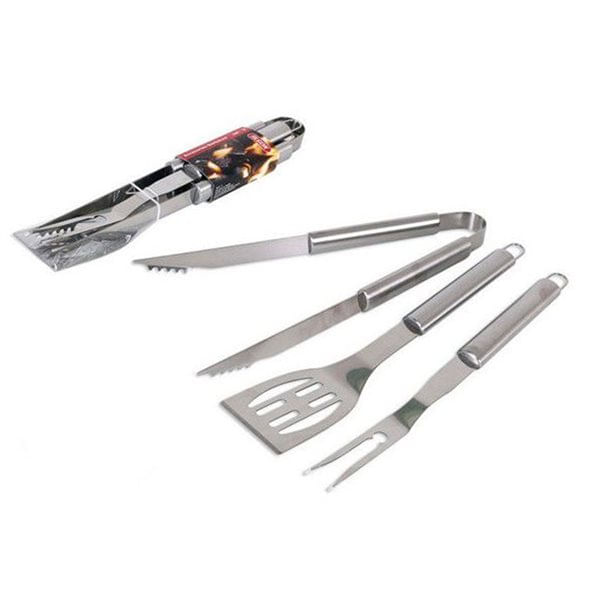 ¿Te gusta disfrutar de fantásticas comidas y cenas con familia y amigos? ¿Sueles cocinar tus platos en barbacoa? Te presentamos este set genial de accesorios que te hará mucho más fácil esos momentos culinarios. Incluye, una espátula, un tenedor y unas pinzas para servir. La espátula y el tenedor cuentan con un aro para colgarlos y tenerlos siempre a mano. Son de acero inoxidable y de color plateado. Se mantienen resistentes de una sesión de barbacoa a la siguiente. Las asas largas ayudan a mantener las manos a una distancia segura del calor. Las anillas en los extremos permiten colgarlos cómodamente.