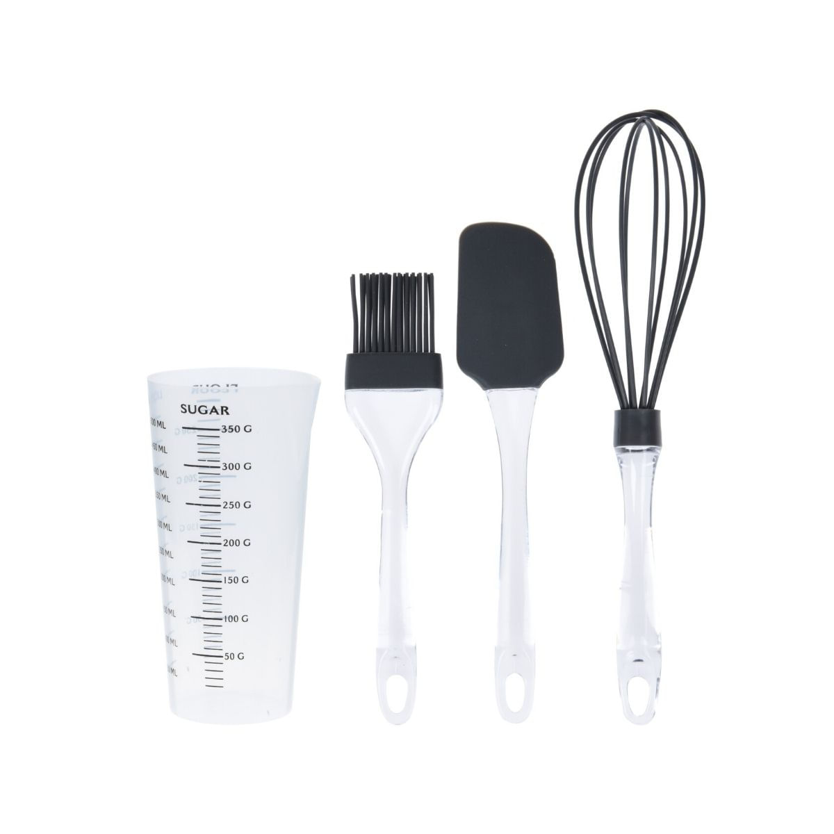 El set de 4 accesorios de repostería es perfecto para convertirte en el chef que deseas. El set está compuesto por 4 piezas entre las que encontrarás, un vaso medidor, una espátula, un batidor de varilla y un pincel. Todos los utensilios están fabricados en resistente silicona ideal para cocinar a cualquier temperatura. Su vaso medidor cuenta con una capacidad de 500 ml perfecto para albergar tus mezclas y medirlas con precisión. El mango de todos los accesorios es ergonómico y de materiales de alta calidad.