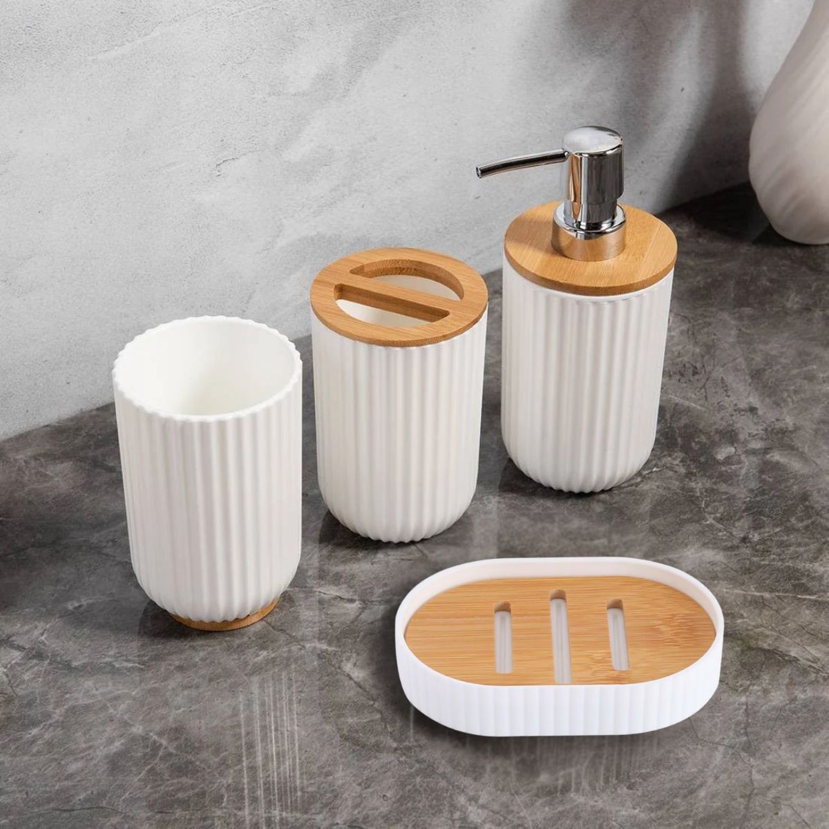 El dispensador cuenta con una bomba que facilita la dosificación del jabón líquido, mientras que la jabonera mantiene el jabón sólido seco y al alcance de la mano. Los vasos son versátiles y ofrecen el espacio necesario para organizar tu rutina diaria con comodidad y estilo. Con este set, no solo optimizas tu baño, sino que también aportas un toque cálido y natural gracias al contraste entre el blanco puro y las tonalidades cálidas de la madera de bambú. Es la elección perfecta para quienes buscan unir diseño, funcionalidad y calidad en su hogar.