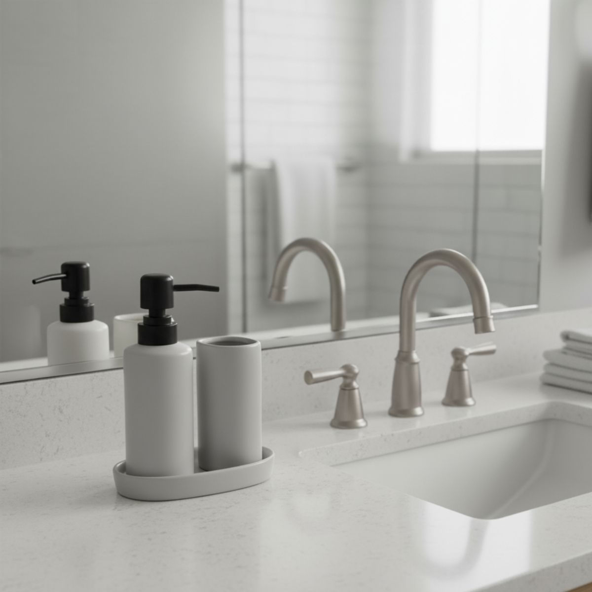 Consigue el set de baño modelo Aqua, un conjunto muy completo pensado para decorar tu aseo y hacerlo mucho más práctico, organizado y agradable a la vista. Está compuesto por tres piezas imprescindibles: un dispensador de jabón con cabezal negro que aporta un elegante contraste y un toque moderno, una jabonera perfecta para mantener tus pastillas de jabón siempre limpias y en buen estado, y un vaso diseñado para colocar el cepillo de dientes, las maquinillas o cualquier pequeño accesorio que quieras tener siempre a mano.