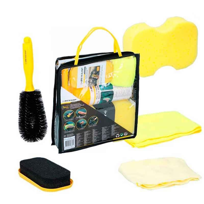 Tendrás tu coche como nuevo con el set de limpieza para coches de la marca Dunlop. Viene todo lo necesario para que cuides hasta el más mínimo detalle cada vez que vayas a lavarlo. El set incluye: 1 esponja de lavado, ideal para acabar con esas manchas más resistentes, 1 limpiador de salpicaderos con aroma a vainilla que será perfecto para limpiar y dar brillo, 1 paño de microfibra para eliminar el polvo fácilmente, 1 gamuza y 1 cepillo para las ruedas. Todo el juego viene en una práctica bolsa de almacenamiento para que puedas dejarlo en el maletero sin que ocupe apenas espacio.