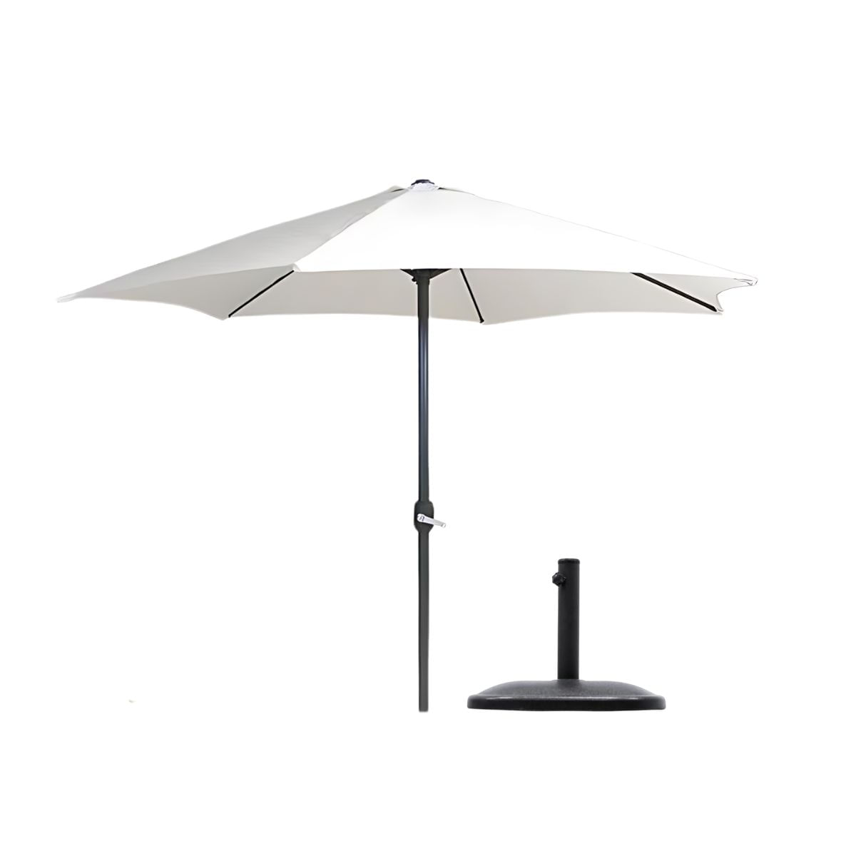 Hazte ya con este magnifico set de sombrilla más pie modelo Iris y comienza a disfrutar de los días al aire libre. Cubre tu jardín o terraza con esta sombrilla de gran diseño y elegante. La medida de la sombrilla es de 247 cm de alto, por lo que cubre una gran superficie creando espacios habitables durante los momentos del día en los que el sol calienta más fuerte. Tejido de poliéster en color, adecuado para exterior. Estructura de aluminio con tubo central de 48 mm de diámetro, lo que garantiza una mayor sujeción. Compuesta por un soporte de aluminio súper resistente y 6 varillas de acero que la hacen todavía más eficaz. La solución perfecta para colocar en cualquier espacio exterior y crear zonas de sombra donde disfrutar de tus vacaciones de verano. Además, su pie modelo Iris cuenta con una base cuadrada y un peso de 25kg, perfecto para poder soportar el peso de la sombrilla sin temor a que se vuele o vuelque. Además, gracias a su material de fabricación de alta calidad, es muy resistente. Es apto para mástiles de entre Ø3,5 y Ø5,5 cm de diámetro. ¡Por fin disfrutarás de esas comidas con la familia y los amigos bajo sombra a un precio bestial!