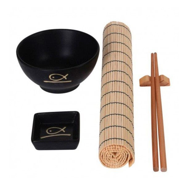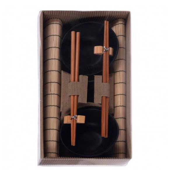 Tal y como manda la tradición, este juego guarda una estética minimalista y muy cuidada. Consta de dos servicios y de doce piezas: 2 pares de palillos de bambú, de 24 cm de longitud con sus respectivos soportes; 2 cuencos de cerámica negra; 2 de menor tamaño para servir las salsas, los rollos o cualquier otra variedad de sushi. También incluye dos esterillas de bambú que podrás utilizar de salvamanteles o para conseguir un perfecto enrollado.