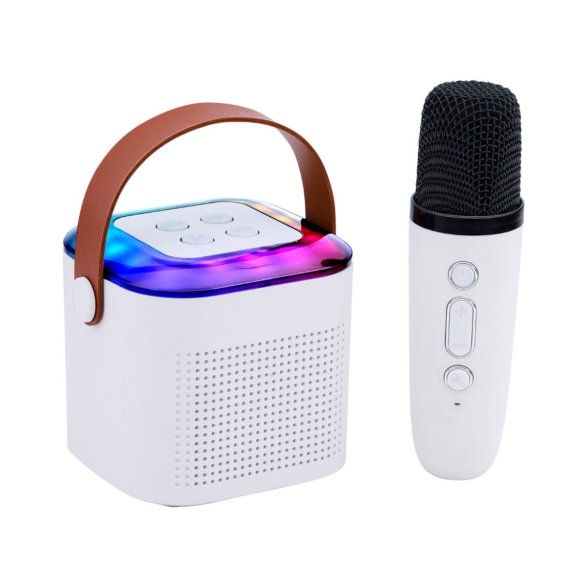 Gracias a su diseño compacto y portátil, podrás llevarlo a cualquier lugar: viajes, cumpleaños, despedidas de soltero y mucho más. La diversión irá siempre contigo. Este set incluye un micrófono para animar a tus amigos y mantener el ambiente festivo. Con 5W de potencia y conectividad Bluetooth 5.3, podrás vincularlo fácilmente a cualquiera de tus dispositivos, disfrutando de un sonido potente y envolvente. Su batería se carga en solo 2-3 horas y ofrece hasta 1,5 horas de uso continuo sin las luces encendidas. Además, cuenta con 9 efectos de sonido para personalizar tu experiencia y una función de apagado automático tras 10 minutos de inactividad. ¡Descubre el Mini Karaoke Set a un precio irresistible y conviértete en el alma de la fiesta!