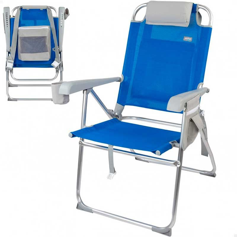 La silla de playa de la marca Aktive se caracteriza por ser muy fácil de transportar gracias a su sistema plegable que la convierte en una mochila muy cómoda de llevar contigo. Está fabricada con estructura de aluminio y asiento de textileno de color azul y soporta un peso máximo de 110kg. Es multiposición, ofreciendo 8 posiciones diferentes que podrás ajustar con los reposabrazos. Podrás guardar tus pertenencias en su bolsa trasera y su bolsillo lateral y para un mayor confort, incluye 1 cojín para la cabeza.