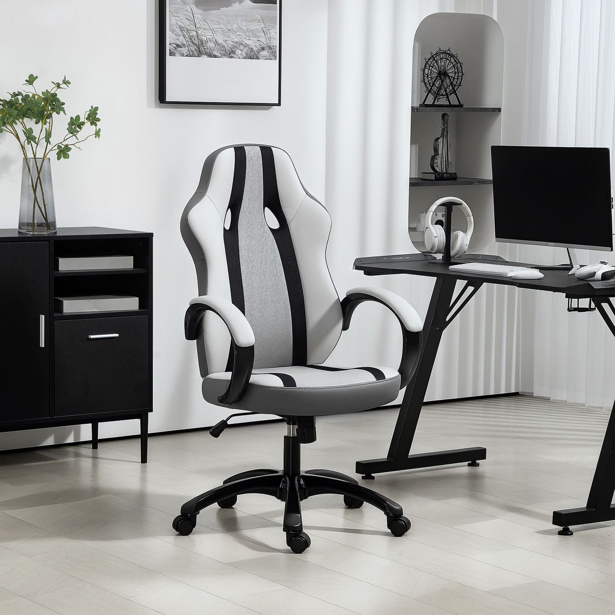 La silla gaming Trex de Homcom combina diseño moderno y funcionalidad para transformar tu experiencia frente al escritorio. Con un estilo tipo racing, esta silla es perfecta tanto para sesiones intensas de juego como para largas jornadas de trabajo en casa o estudio. Su asiento y respaldo están revestidos con una combinación de cuero PU y tejido de malla, lo que proporciona una sensación agradable al tacto y facilita su limpieza diaria. El respaldo acolchado con espuma ofrece un apoyo cómodo a lo largo del día, mientras que su función de inclinación suave permite balancearse ligeramente, favoreciendo la relajación durante los descansos. La base cuenta con ruedas de PU que permiten desplazarse con facilidad sin dañar el suelo, y la estructura giratoria de 360° asegura libertad de movimiento en todo momento.