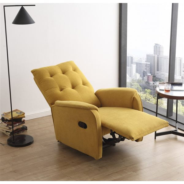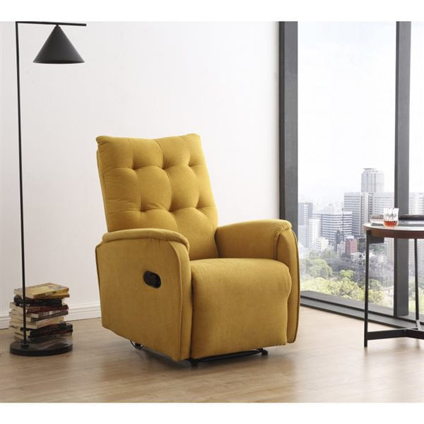 Sillón de relax Modelo: Swing Color: Mostaza Tapizado con tejido de tela resistente Diseño capitoné en el respaldo Asiento, respaldo y apoyabrazos acolchado Apertura y reclinado manual Reposapiés extensible Sistema pared cero Base metálica color negro de gran soporte Soporta hasta 110 kg Medidas: 93 cm de alto, 70 cm de ancho, y 80 cm de largo Peso: 30 kg