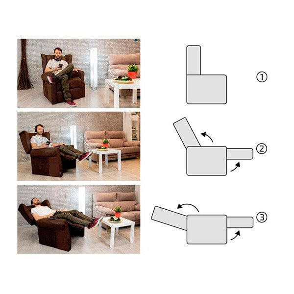 El sillón Copenhague aúna diseño y bienestar, ofreciendo máximo confort en cada una de las 3 posiciones de reclinado que ofrece: posición sentado, reclinado y acostado. Para reclinar el respaldo es suficiente con hacer una pequeña presión con la espalda y el reposapiés se eleva a la vez.