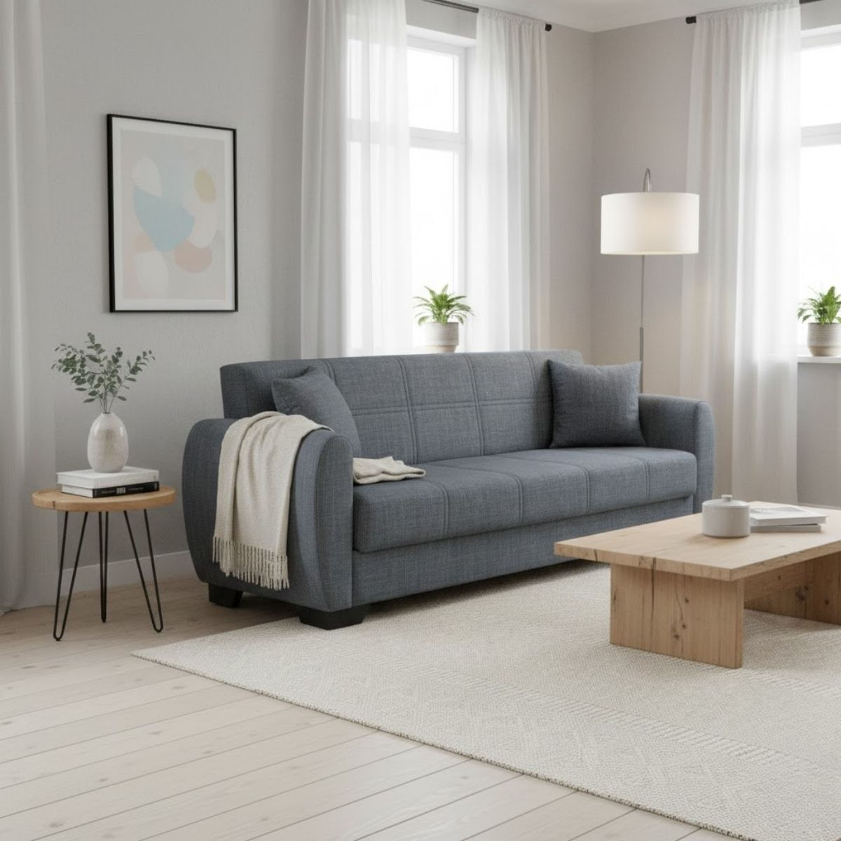 Renueva cualquier estancia con este sofá cama modelo Astara, una pieza moderna y funcional pensada si buscas comodidad, estilo y practicidad en un solo mueble. Su diseño minimalista en color gris se integra con facilidad en salones, estudios, despachos o habitaciones de invitados, aportando un toque actual sin recargar el ambiente. El tapizado en color gris neutro ofrece una estética muy versátil, ideal para combinar con distintos tipos de decoración. Sus líneas rectas, el acolchado uniforme y las patas metálicas refuerzan ese aire elegante y actualizado, convirtiéndolo en el protagonista de tu hogar.