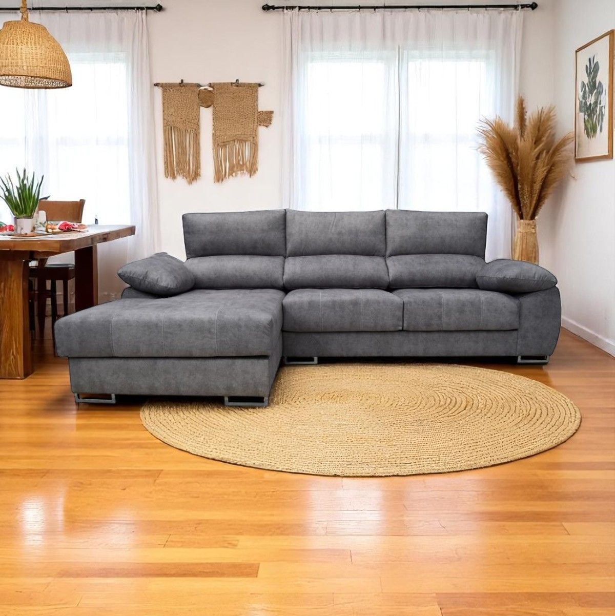Transforma tu salón con el sofá chaiselongue Paolo, ahora con frente a la izquierda y tapizado en la elegante y resistente tela Magia. Su diseño moderno con pespuntes blancos y acabado de alta calidad lo convierten en una pieza protagonista que se adapta fácilmente a cualquier estilo de decoración. Este sofá ha sido diseñado para ofrecer una experiencia de descanso superior. Sus asientos están fabricados con gomaespuma de alta densidad, mientras que los respaldos, rellenos de fibra hueca siliconada, garantizan una postura cómoda y ergonómica. Incluye cabezales reclinables y asientos deslizantes, ideales para personalizar tu confort según tus necesidades.