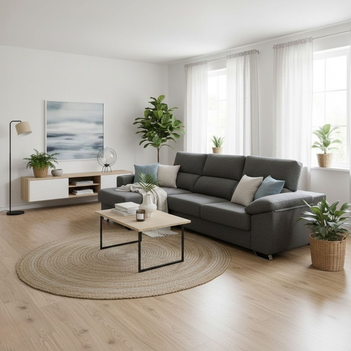 Los asientos están elaborados con espuma de poliuretano super suave, ofreciendo una acogida mullida y envolvente. Además, tanto brazos como respaldos cuentan con relleno de fibra 100%, creando un acolchado uniforme que intensifica la sensación de confort en toda la pieza. Este modelo se presenta tapizado en tela Nevada, un tejido resistente, suave y muy práctico para el día a día. Disponible en gris y gris oscuro, combina con facilidad en salones modernos, nórdicos o neutros, aportando elegancia y armonía visual al espacio. Sus patas de 5,5 cm elevan el sofá para facilitar la limpieza y mantener el ambiente más ordenado y cómodo.
