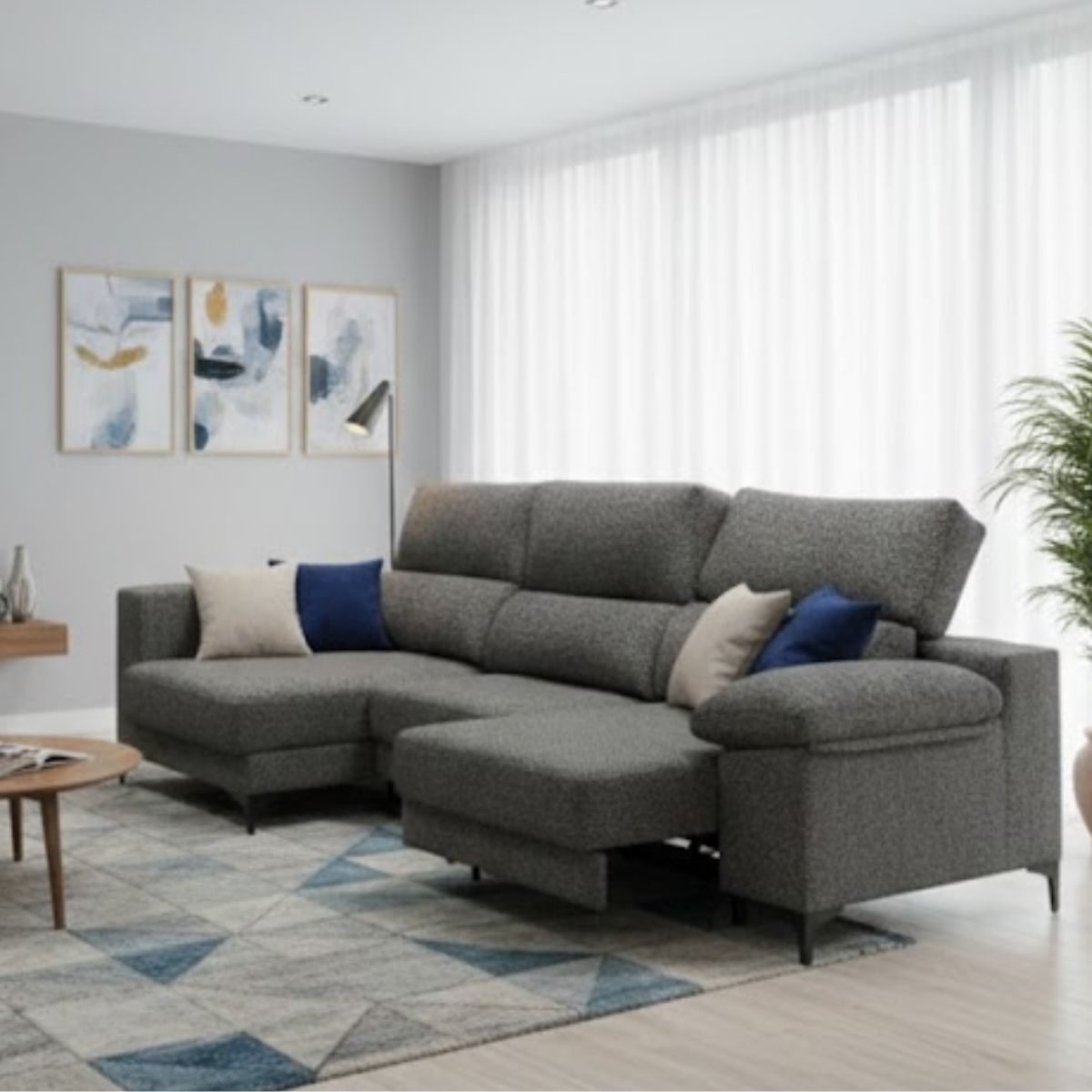 El sofá chaiselongue modelo Santorini llega para convertirse en el rey absoluto de tu salón gracias a su diseño cómodo, funcional y con ese puntito elegante que siempre se agradece cuando quieres renovar tu espacio sin complicarte la vida. Este modelo combina una estructura resistente de madera de pino y MDF con un estilo actual que encaja tanto en ambientes modernos como en salones más clásicos, todo con un acabado pensado para durar y para que el confort sea el protagonista desde el primer minuto. Sus asientos deslizantes de larga extensión están diseñados para que puedas ajustarlos sin esfuerzo y conseguir tu postura ideal ya sea para ver pelis, echarte una siesta estratégica o simplemente estirar las piernas después de un día intenso. El respaldo incorpora un cabezal reclinable que te permite regular la inclinación según lo que necesites, aportando un extra de comodidad que marca la diferencia en el uso diario.