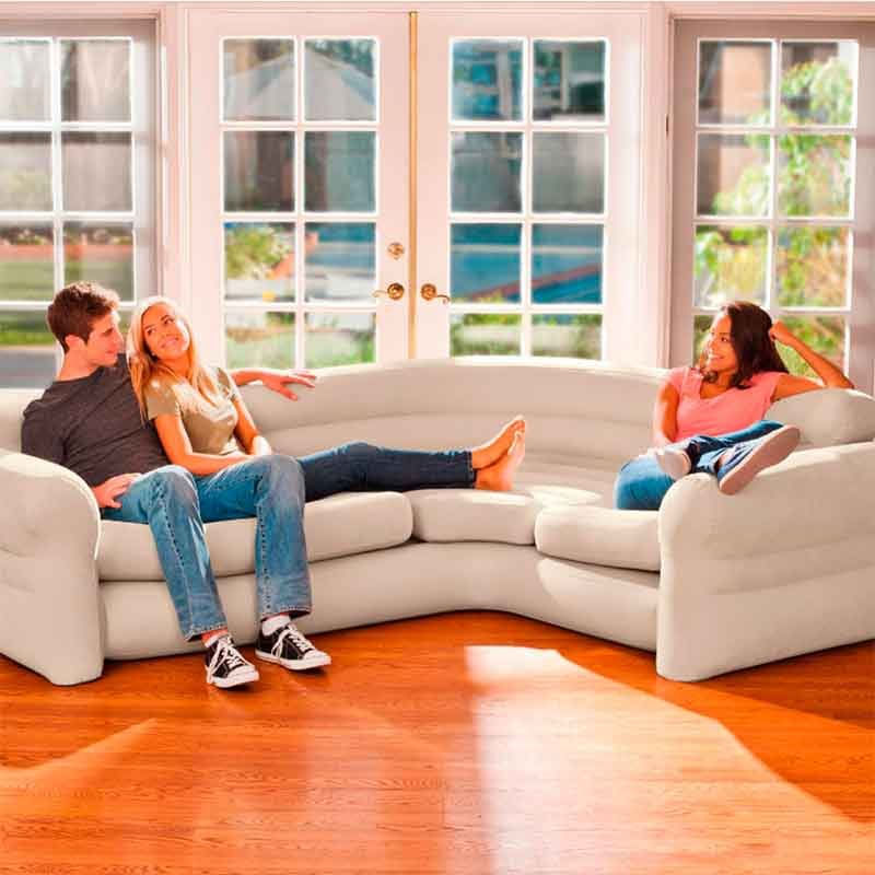 De color crema y formato rinconera, así es el práctico sofá hinchable de la marca Intex. Está fabricado con PVC de alta calidad y tiene un acabado exterior aterciopelado que lo hace muy confortable y suave al tacto. Además, es altamente resistente al agua, por lo que podrás utilizarlo tanto en interior como en exterior. Para un rápido hinchado y deshinchado, cuenta con válvula 2 en 1 y se recomienda inflarlo con bomba de aire eléctrica o manual (no incluidas con el sofá). Tiene capacidad para 4 personas e incluye kit de parches para que puedas reparar pequeños poros o pinchazos.