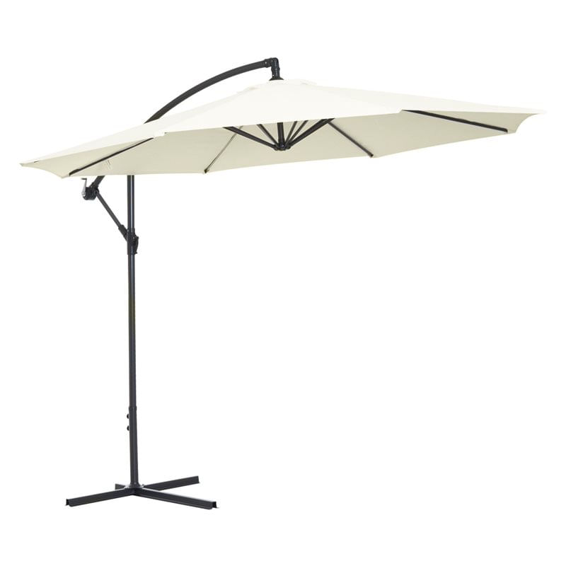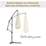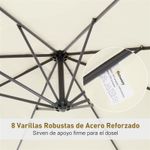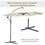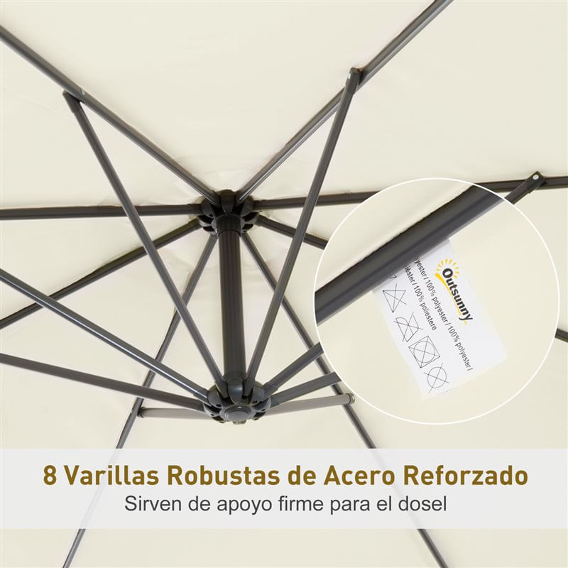 Esta sombrilla de la marca Outsunny es ideal para proteger la zona exterior de tu hogar y disfrutar de ella sin preocuparte del sol. Su diseño con poste excéntrico te ofrece un espacio sombrado que no se ve condicionado como pasa en ocasiones con las sombrillas con poste central, protegiendo del sol incluso mesas grandes, conjuntos y más. Con estructura robusta de metal con 8 varillas que sujetan firmemente el toldo, proporciona mucha sombra, refresca los calurosos días de verano y también crea un ambiente agradable. Viene en un combinable color beige.