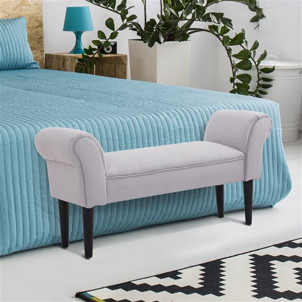 ¿Estás buscando una fantástica banqueta tipo taburete para poder decorar cualquier habitación de tu hogar? Te presentamos este fantástico taburete el cual podrás tener en tu dormitorio, recibidor, vestidor, salón o en cualquier otro sitio de tu hogar. Es ideal como banco para vestirse o calzarse. El diseño es elegante y combina perfectamente con el resto de muebles de tu hogar. Está totalmente acolchado, por lo que es muy cómodo. Los brazos son curvos y enrrollados, dándole un toque especial a la banqueta. Materiales de alta calidad. Este banco es justo lo que andabas buscando y te ayudará a facilitarte el día a día. Ideal para dormitorio, recibidor, comedor o cualquier habitación. Cubierta de tela de lino con un tacto muy agradable, rellena de una suave esponja. El espesor del cojín del asiento es de 20cm y sus patas de madera maciza, aportan gran estabilidad y seguridad. Las almohadillas de las patas se pueden ajustar para adaptarse en el caso de que el suelo sea irregular. Montaje rápido y sencillo.