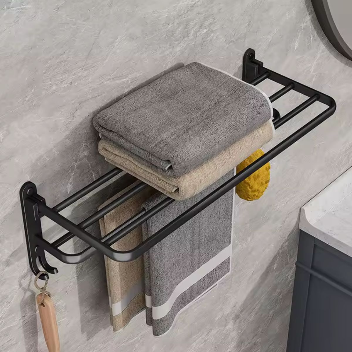 El toallero ideal para tu baño combina funcionalidad, diseño moderno y durabilidad, siendo perfecto para organizar y optimizar tu espacio. Este práctico accesorio está diseñado con un estante superior de rejilla, perfecto para colocar toallas dobladas, artículos de baño o incluso elementos decorativos. Además, cuenta con dos barras inferiores para colgar toallas, permitiendo que se sequen de manera eficiente y estén siempre a la mano. Para mayor versatilidad, incluye dos ganchos laterales ideales para colgar esponjas, cepillos o cualquier otro objeto pequeño que necesites tener accesible.