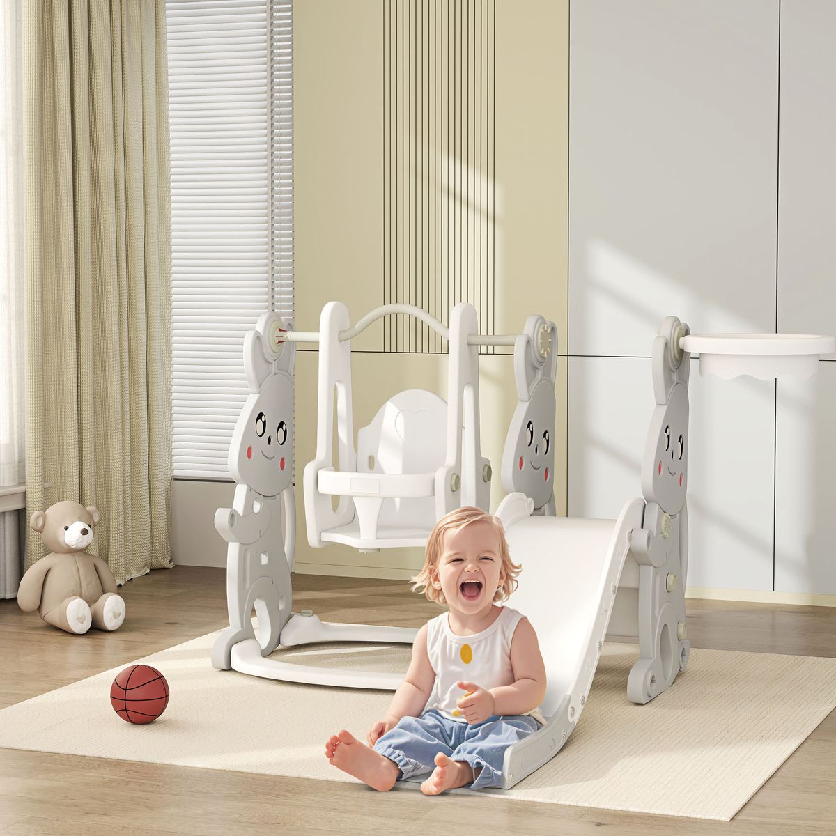 El tobogán infantil con columpio y canasta 4 en 1 Aiyaplay Bunny convierte cualquier rincón en un parque de diversión y aprendizaje. Diseñado para peques de más de 18 meses, combina tobogán, columpio, trepador y aro de baloncesto, fomentando la coordinación, el equilibrio y el movimiento activo mientras se lo pasan en grande. Su estructura estable y segura, fabricada en HDPE resistente e inodoro, ofrece un juego fiable y duradero. El columpio incluye una barra de seguridad delantera en forma de T y respaldo alto, mientras que el tobogán dispone de escalones antideslizantes, barandillas altas y una pista amplia para un deslizamiento suave y controlado. La base puede llenarse con agua para ganar firmeza y evitar movimientos durante el juego. Con su diseño de conejo, este set no solo añade un toque divertido, sino que también estimula la imaginación y la creatividad infantil. Fácil de montar sin herramientas especiales, este conjunto promete horas de juego seguro y entretenimiento familiar en casa o en el jardín.