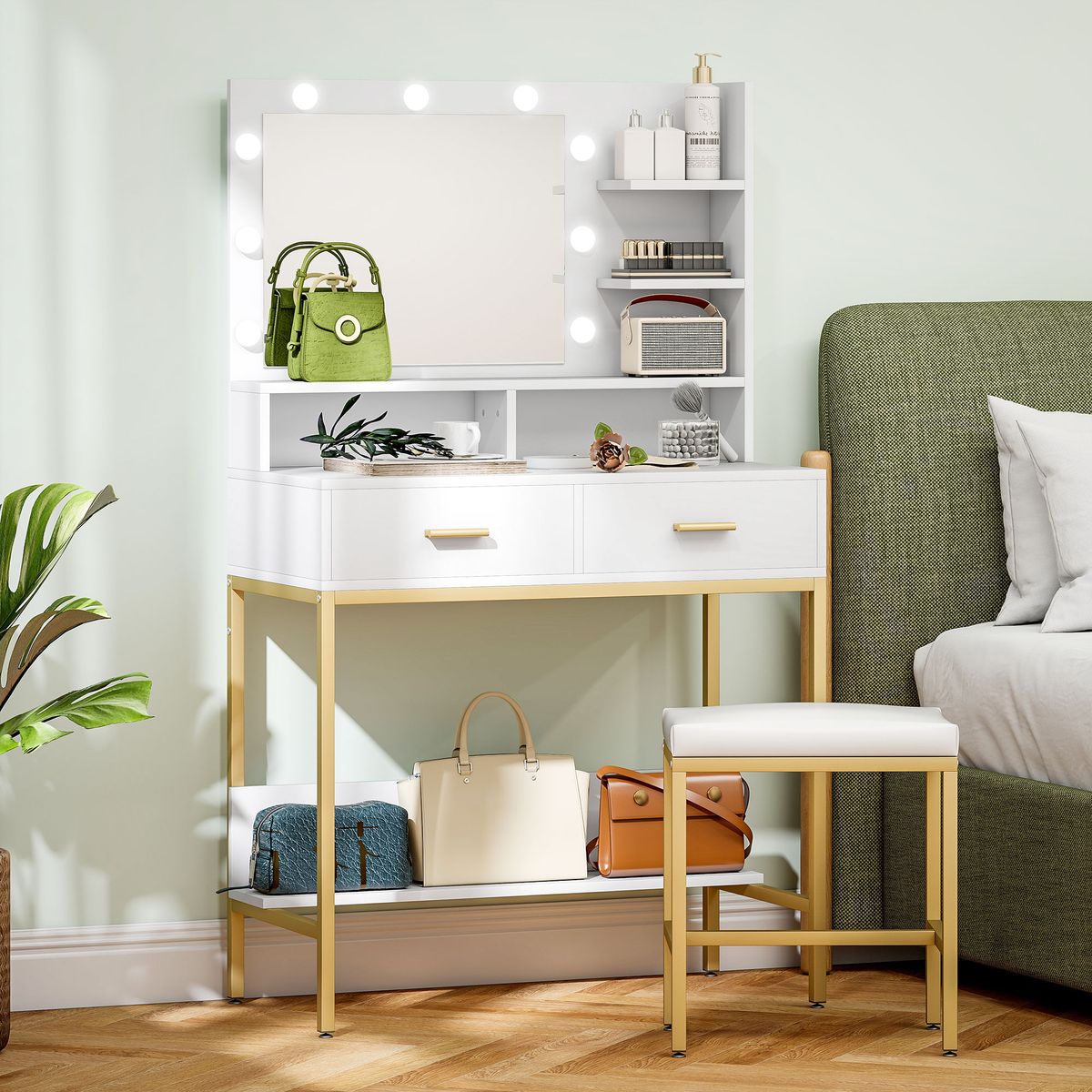 Tocador de maquillaje Aura con taburete, diseñado para combinar estilo, comodidad y funcionalidad. Este conjunto incluye un tocador blanco con espejo iluminado por nueve bombillas LED, ofreciendo la luz perfecta para maquillarte o arreglarte con precisión. Dispone de dos amplios cajones, cinco estantes abiertos y un estante inferior espacioso, proporcionando un lugar ideal para organizar cosméticos, joyas y otros productos de belleza. El taburete incluido cuenta con cojín acolchado de espuma, garantizando comodidad durante tus rutinas de cuidado personal. Perfecto para dormitorios, vestidores o cambiadores, unifica elegancia y practicidad en un solo mueble.
