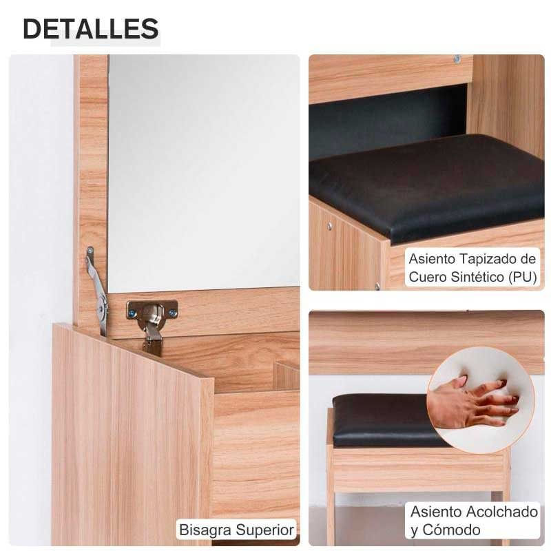 Este conjunto de mesa de tocador de la marca Homcom es perfecto para tu dormitorio, tiene todo lo que necesitas para arreglarte antes de salir. Incluye un tocador con espejo y un taburete acolchado. El tocador está hecho de tablero de partículas y dispone de múltiples espacios para almacenar objetos de forma ordenada y práctica. Su diseño moderno se adapta perfectamente a tu hogar, es fácil de combinar con el resto de mobiliario ya que mientras que se mantenga cerrado podrás utilizarlo como escritorio y cuando quieras maquillarte o peinarte solo tendrás que levantar el espejo.