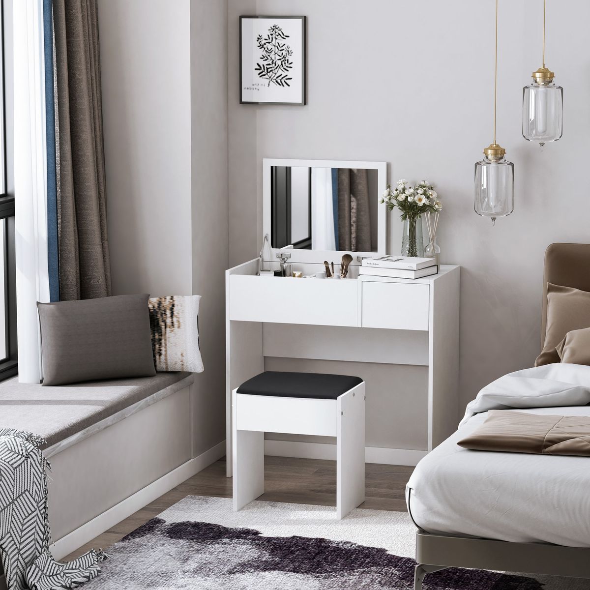 Fabricado en tablero de partículas de clase E1, este mueble es resistente, ecológico y de larga durabilidad. Incluye un taburete acolchado que complementa la comodidad y funcionalidad del conjunto. Las bisagras resistentes al moho y la corrosión garantizan un uso prolongado sin preocupaciones. Ideal para quienes buscan optimizar el espacio sin renunciar al estilo, este tocador se integra fácilmente en dormitorios modernos, juveniles o minimalistas. Un mueble dos en uno que hará más fáciles tus rutinas y dará un toque especial a tu habitación.