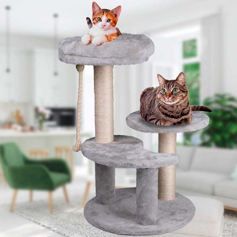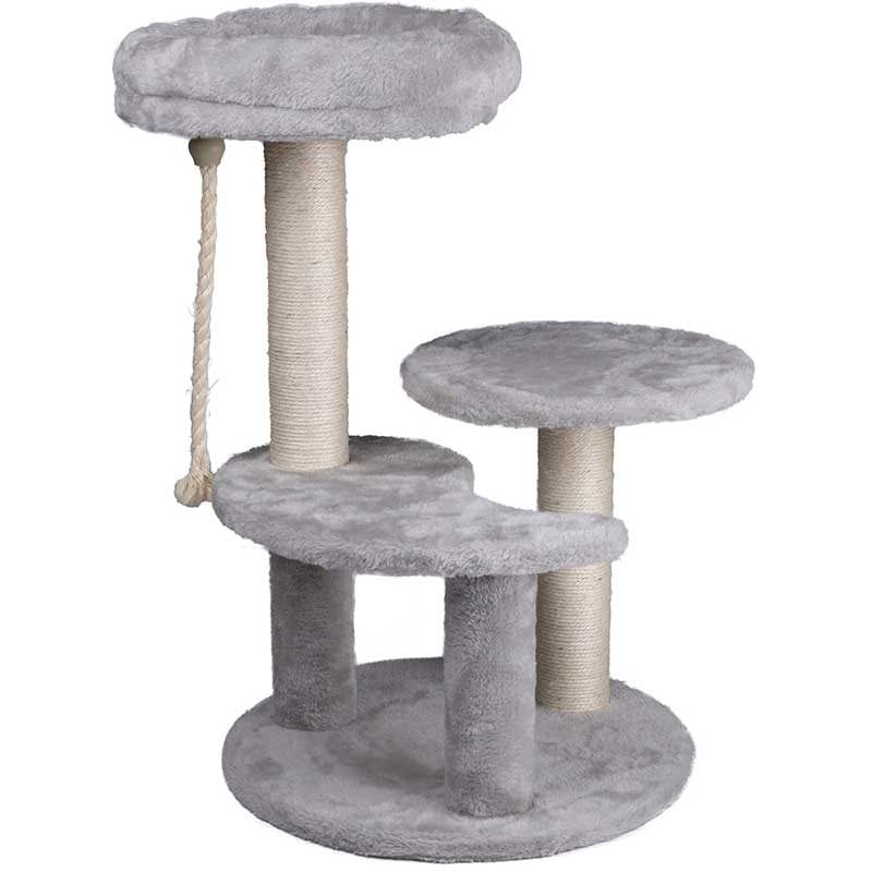 Tus gatos disfrutarán de lo lindo con la torre con rascador para gatos de la marca Pet Comfort. Es apta para gatos de todos los tamaños y cuenta con 3 niveles diferentes para que puedan jugar, rascar sus uñas y descansar cómodamente. Está fabricada en tablero resistente y tapizada con una suave felpa esponjosa de color gris. El sisal se envuelve alrededor de 2 de los postes para que tus gatos puedan afilarse las uñas fácilmente. Es muy fácil de montar y gracias a su diseño y combinación de colores quedará genial en cualquier estancia de tu hogar.