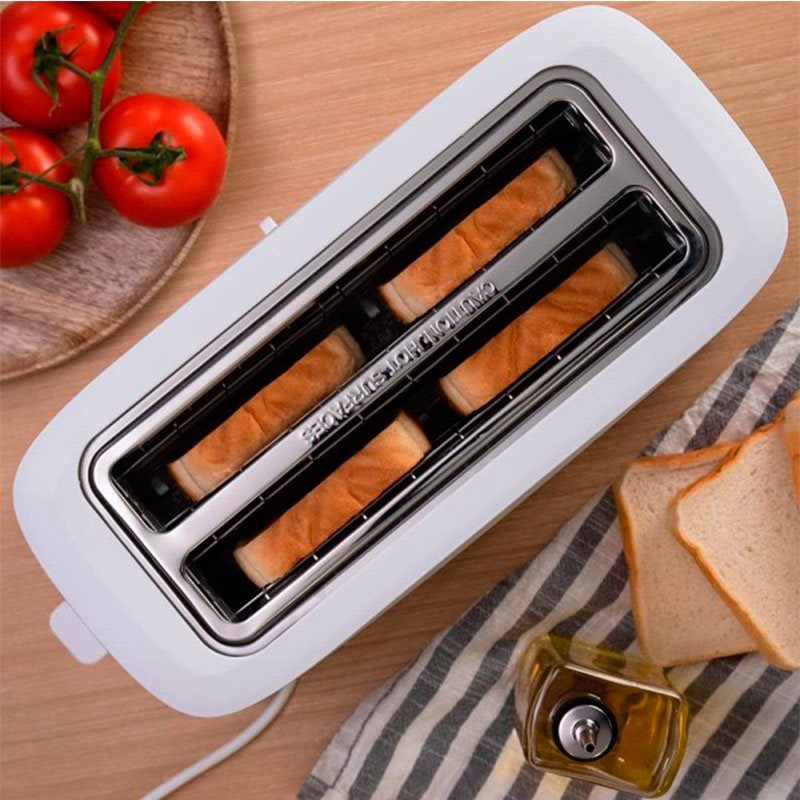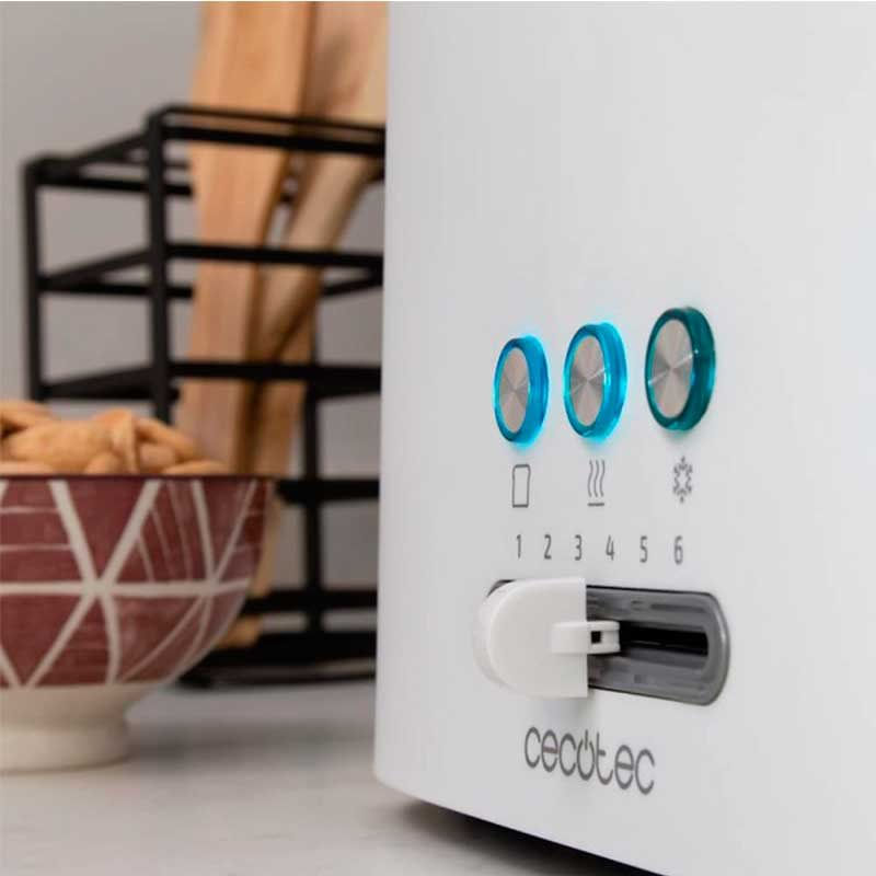 La tostadora modelo Toast&Taste 16000 Extra Double White de la marca Cecotec cuenta con una potencia de 1630W, es de doble ranura y tiene capacidad para 4 tostadas. Su diseño elegante en acabado blanco con detalles en acero inoxidable hará que quede genial en tu cocina. Cuenta con 3 funciones preconfiguradas: recalentar, descongelar y cancelar. Y viene con 6 niveles de tostado para adaptarlo a tus gustos y preferencias. Además, gracias a sus varillas superiores podrás calentar alimentos de gran tamaño como bollería, gofres o pasteles. Viene con función extraelevación para que puedas retirar el pan fácilmente y bandeja recogemigas para facilitar su limpieza. Su base es antideslizante para que puedas usarla con total comodidad.