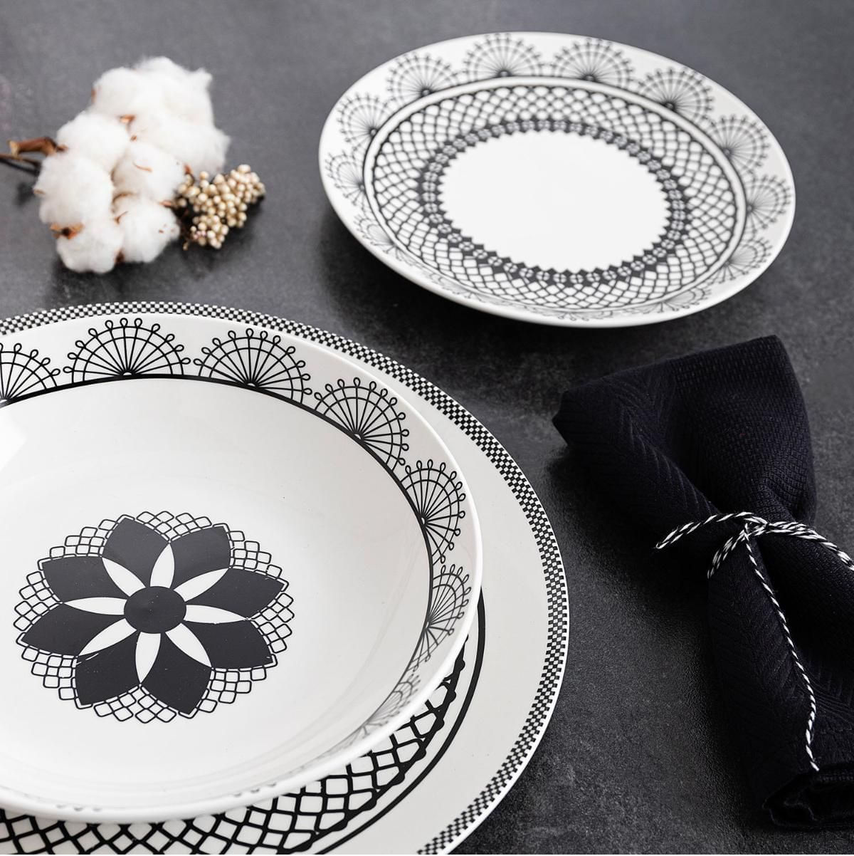 Añade un toque de elegancia a tu mesa con la vajilla modelo Medina de La Bouchée By La Cartuja de Sevilla, una opción ideal para impresionar a tus invitados. Su diseño sencillo pero sofisticado hará que combine perfectamente con cualquier mantel o cubiertos, aportando un estilo atemporal que se adapta a cualquier ocasión. Esta vajilla está compuesta por un total de 18 piezas, que incluyen 6 platos llanos, 6 platos hondos y 6 platos de postre, lo que la convierte en una opción ideal para servir comidas a un máximo de 6 personas. Gracias a sus tamaños, podrás ofrecer raciones generosas de tus recetas favoritos, garantizando una experiencia inolvidable de lo más agradable para todos los comensales.