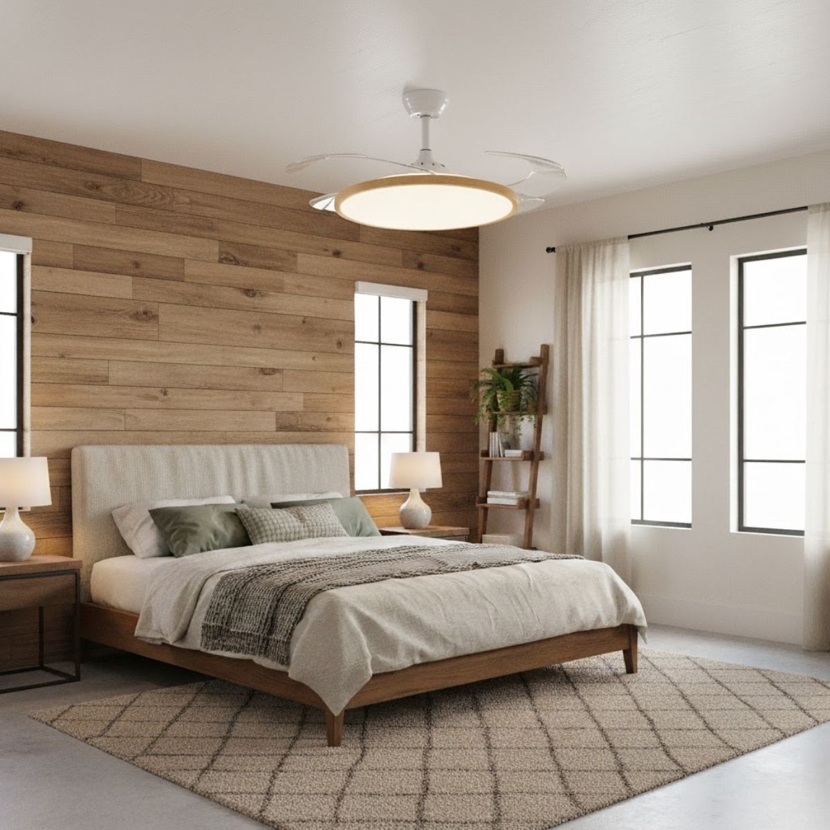 El ventilador de techo Eolia en acabado natural destaca por su estilo moderno y su gran versatilidad. Está equipado con cuatro aspas retráctiles fabricadas en ABS transparente, que se pliegan con suavidad cuando no se utilizan, permitiendo que el ventilador funcione únicamente como lámpara. Su zona de iluminación LED ofrece una luz amplia y agradable, ideal tanto para habitaciones como para estancias más grandes. Con una potencia de 72W y tres tonos de luz seleccionables, podrás ajustar el ambiente según la ocasión o el momento del día.