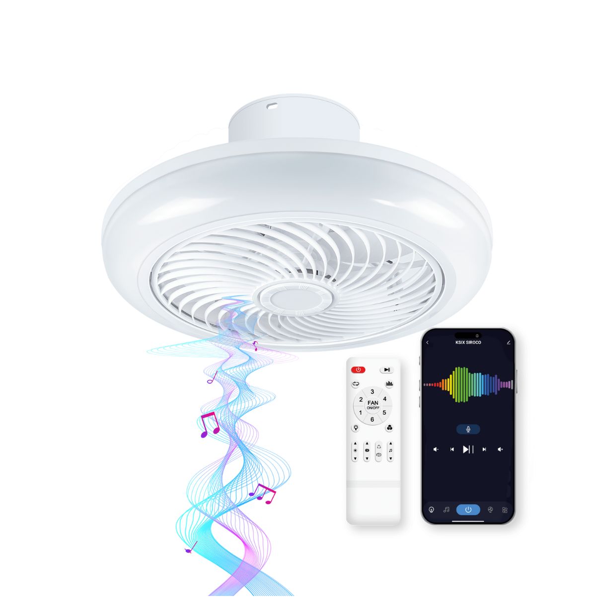 El modelo Siroco es muy fácil de manejar también a través de su control remoto, lo que te permite ajustarlo sin necesidad de estar conectado a la app. Con una potencia de 18W para el ventilador, 43W para la luz y 5W para el altavoz, ofrece un excelente rendimiento, con un flujo luminoso de 3.000 lm y una temperatura de luz ajustable entre 3.000K y 6.500K. Sus dimensiones de 46 x 22 cm lo hacen adecuado para espacios medianos y grandes. Este ventilador de techo es la opción perfecta para quienes buscan eficiencia, confort y tecnología inteligente en su hogar.