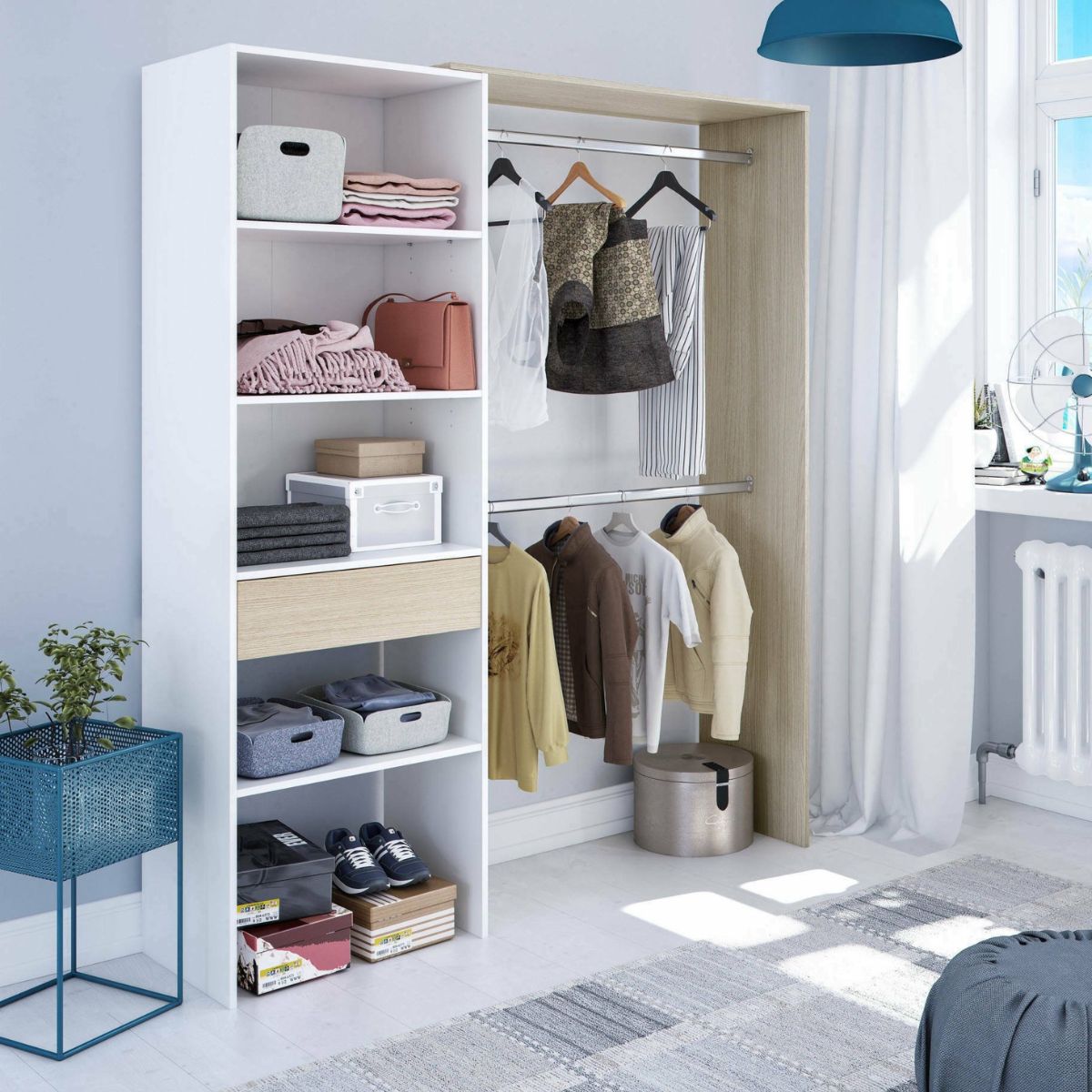 Este vestidor es perfecto para los amantes de la moda ya que en un solo vistazo podrás visualizar todos tus conjuntos y accesorios. Cuenta con mucho espacio de almacenaje ya que viene con 2 barras de aluminio para colgar, 4 estantes y 1 cajón. Está fabricado en tablero de partículas melaminizado, el cajón cuenta con guías correderas metálicas y en la parte inferior del mueble viene con tacos ABS quitarruidos y antirrayaduras. Dispone de 2 posiciones posibles ya que la estantería puede montarse a izquierda o a derecha para que puedas aprovechar al máximo el espacio que posees.