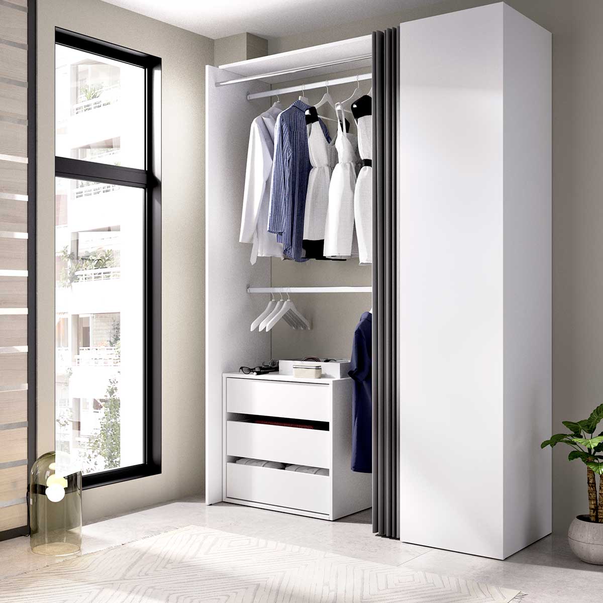 Si buscas versatilidad en un armario/vestidor, este vestidor de la colección Suit te sorprenderá. Se trata de un vestidor compuesto por 1 puerta abatible a un lateral que esconde tras su puerta 5 prácticos estantes. Al otro lado vemos la zona de las 2 barras para colgar junto con su estética cortina y su cajonera de 3 cajones y repisa superior. El mueble está fabricado en melamina de buena calidad, un material que nos asegurar una mayor resistencia al paso del tiempo. Presenta una estética minimalista con una superficie lisa. Una de sus mayores virtudes es su gran versatilidad, puesto que podrás organizar tu ropa de mil maneras diferentes. Perfecto para todo tipo de dormitorios, este vestidor te enamorará desde el primer momento en el que lo veas. ¡Consíguelo ahora al mejor precio en Embargosalobestia!
