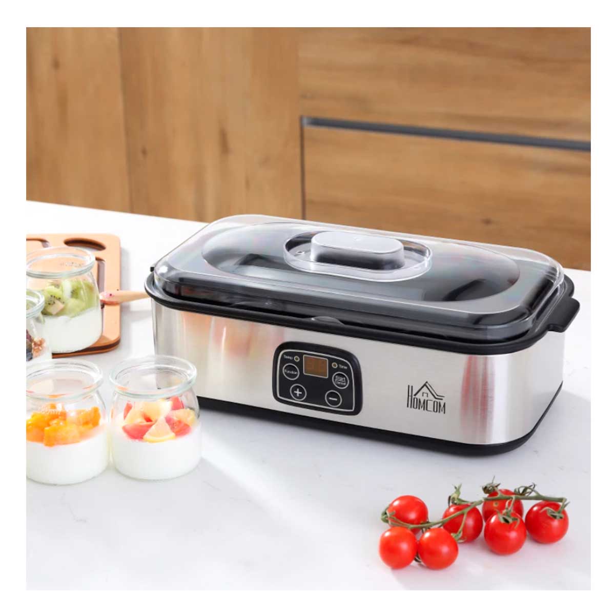 ¿Te encantaría hacer tus propios yogures en casa? Ahora es posible gracias a esta estupenda yogurtera de Homcom. Tiene una estructura que garantiza la transmisión constante de calor para la activación de Lactobacillus, con bajo consumo gracias a sus 30W de potencia. Es muy fácil de usar gracias a su pantalla incorporada en la que podrás ajustar el tiempo y la temperatura. Cuando termine la elaboración, se apagará automáticamente y emitirá un sonido para avisarte. La temperatura se puede ajustar entre 20 y 55ºC, así como el temporizador entre 1 a 48 horas para adaptarse a cada preparación. Cuenta con una capacidad total de 1,44L e incluye 8 tarros de cristal con tapa con una capacidad de 180ml cada uno para que puedas elaborar yogures de diferentes sabores o toppings, como frutas de temporada o frutos secos. ¿Te animas a preparar tus propios yogures?